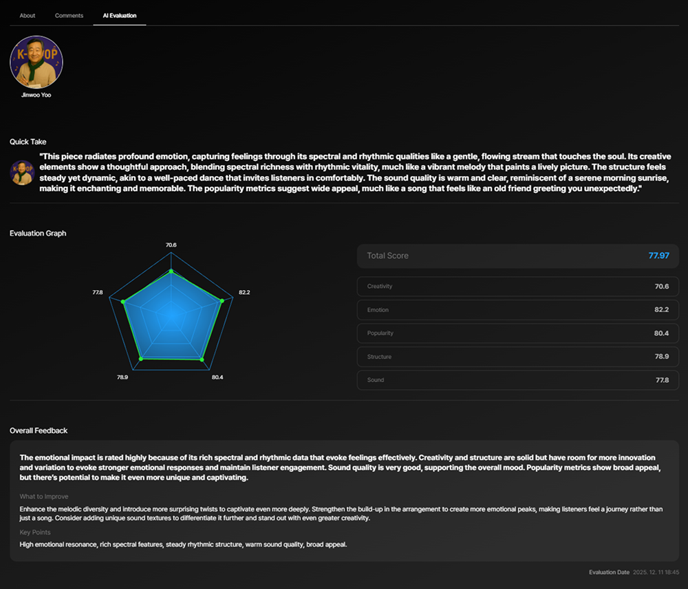Each AI judge analyzes the music based on its own evaluation criteria and provides feedback and improvement points.